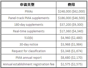 在MDUFA Ⅲ的規(guī)定下,F(xiàn)DA在5年內(nèi)收取5.95億美元費用,MDUFA Ⅲ也擴大了必須支付注冊費用的生產(chǎn)商類型的定義。2013年需繳納的醫(yī)療器械用戶費用(美金)如表1(括號內(nèi)為小型企業(yè)需繳納的費用):